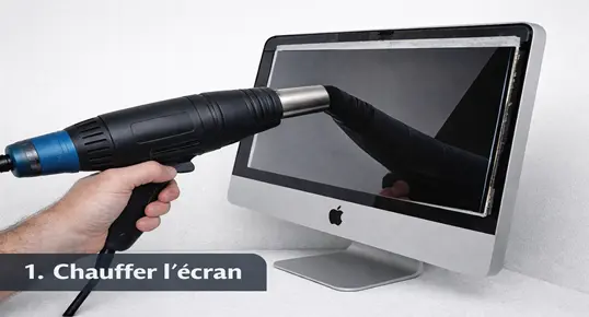 Sur les iMac de 2012 à 2019, l’écran n’est plus fixé avec des vis comme sur les anciens modèles, mais directement collé au châssis grâce à des bandes adhésives très solides. La première étape consiste donc à chauffer délicatement les bords de l’écran afin de ramollir la colle et permettre un décollage en toute sécurité. Pour cela, j’utilise un outil adapté comme un pistolet thermique, en contrôlant parfaitement la température pour éviter d’endommager la dalle. Cette opération demande de la précision, car l’écran reste une pièce fragile et coûteuse. Une chauffe trop forte ou un geste brusque peut entraîner une casse. Une fois l’adhésif suffisamment assoupli, l’écran peut être retiré progressivement, ce qui permet ensuite d’accéder aux composants internes de l’iMac pour poursuivre le remplacement du disque dur.