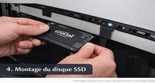 Après avoir retiré l’ancien disque dur, on passe à l’étape la plus importante de l’intervention : l’installation du SSD. Le disque SSD vient remplacer directement le HDD d’origine, tout en étant beaucoup plus rapide et fiable. Je le monte soigneusement dans l’emplacement prévu, en utilisant les adaptateurs nécessaires selon le modèle d’iMac, puis je reconnecte les câbles d’alimentation et de données de façon sécurisée. Cette étape marque le véritable changement, car c’est ce nouveau support de stockage qui va permettre à l’iMac de retrouver une seconde jeunesse. Une fois le SSD en place, la machine est prête pour être refermée et recevoir une installation propre de macOS, avec des performances nettement améliorées dès le premier démarrage.