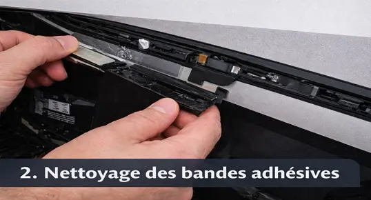 Une fois l’écran retiré, il reste généralement des résidus des anciennes bandes adhésives tout autour du châssis. Cette étape de nettoyage est essentielle, car ces bandes sont responsables de la fixation parfaite de l’écran lors du remontage. Je prends donc le temps de retirer soigneusement toute la colle restante, sans abîmer le cadre ni laisser de morceaux qui pourraient empêcher une bonne adhérence. Le but est d’obtenir une surface propre et uniforme avant de poser les nouvelles bandes. C’est une opération minutieuse, mais indispensable pour garantir un remontage solide, éviter les infiltrations de poussière et assurer que l’écran soit parfaitement maintenu comme à l’origine.