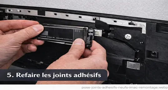 Une fois le SSD installé, il est indispensable de poser de nouvelles bandes adhésives adaptées au modèle d’iMac. Ces joints assurent une fixation solide de l’écran lors du remontage. Cette étape garantit un résultat propre, sécurisé et identique à l’assemblage d’origine.